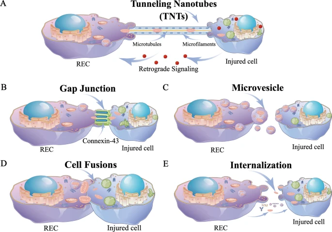 私たちの研究により、幹細胞には「元気なミトコンドリアを、弱っている細胞に分け与える」という能力があることがわかってきました。これを「ミトコンドリア・トランスファー(移動)」と呼びます。 RECは、患者様の細胞と接触したり、細胞同士の架け橋(トンネル)を作ったり、あるいは小さなカプセル(細胞外小胞)を放出したりすることで、健康なミトコンドリアを患者様の細胞へと届けます。 - 一般的な幹細胞よりも高い「回復力」