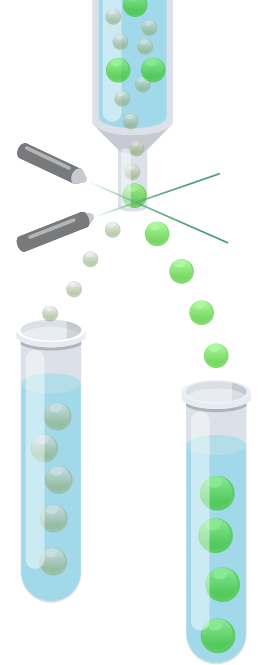 第1段階の密度勾配遠心分離で得られた単核球層には、目的の間葉系幹細胞の他にも多くの細胞が混在しています。そこで、より精密に細胞を選別するために、FACS(Fluorescence-Activated Cell Sorting:蛍光活性化セルソーティング用語)という技術を用います。