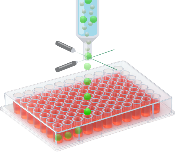 電荷を帯びた細胞が静電気で軌道を変え、目的の場所に分注される