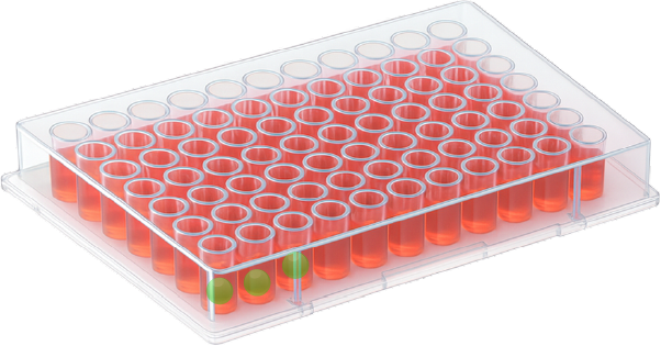 選別基準を通過した0.04%の細胞は、96穴プレートの各穴に1個ずつ配置されます。セルソーターから出てきた細胞を、96個の穴が開いたプレートのそれぞれの穴に正確に1個ずつ落とす精密な作業が行われます。