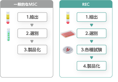 RECに選ばれた細胞は、成長が早いだけでなく、形が整っていて、老化していない若々しい細胞です。さらに、骨や軟骨への変化能力も高く、血管内でも自由に移動できる優れた特性を持っています。これらすべての条件をクリアした細胞のみが「REC」として最終的に認定されます。