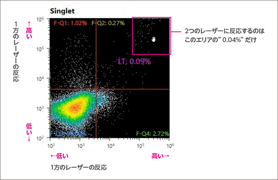 細胞の中から、2本のレーザーに反応する細胞は、わずか0.04%の細胞だけが選別基準を満たします。